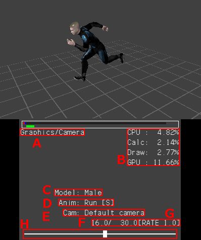 When a model and animation are loaded, animation can be manipulated using the A and B Buttons and the +Control Pad.