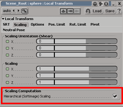 Although it is possible in Softimage to turn settings on and off at the node level (inside Local Transform Properties), as with Classic Scaling of SOFTIMAGE|3D, these properties are set for the entire model.