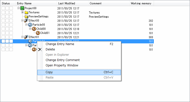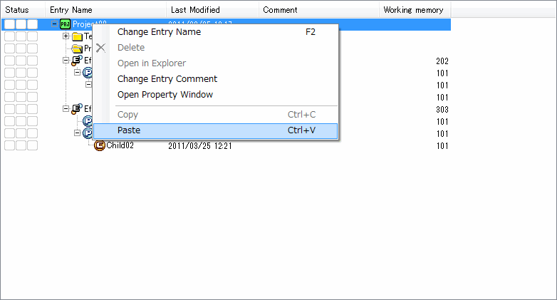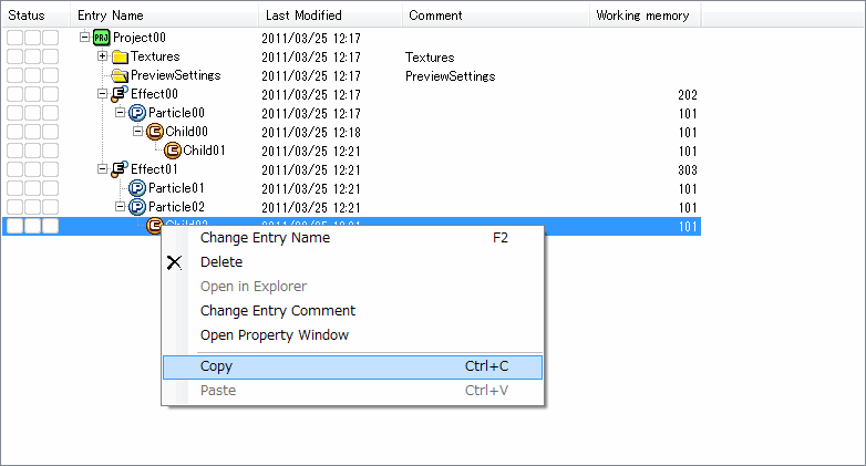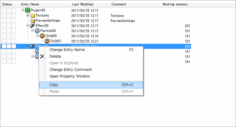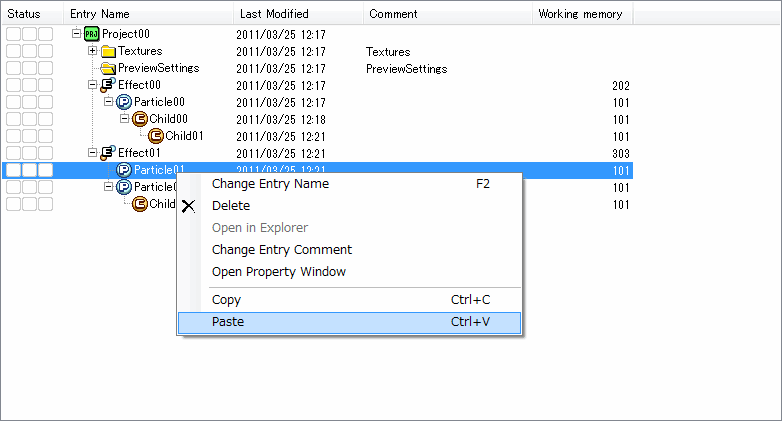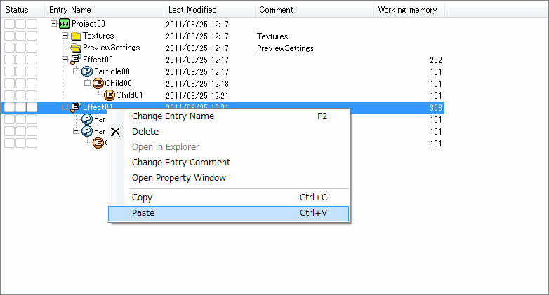 Effects can be pasted to effect nodes or particle set nodes. Child nodes cannot be pasted. You can paste a copied effect by selecting Paste from the context menu displayed by right clicking or by using CTRL+V.