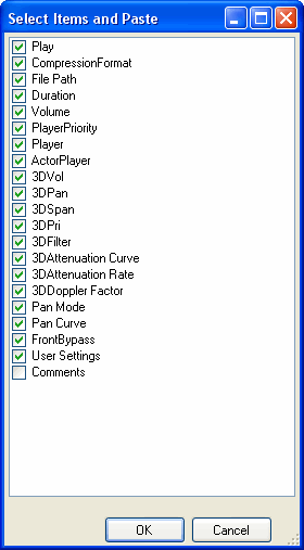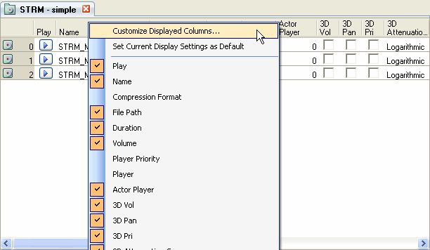 Right-click the part of the Sound Set tab with list item names to open the shortcut menu and then select the items to show or hide. The selections are applied to the list display.