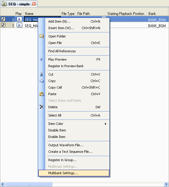 Right-click a sound you want to configure within the sequence sound list, then select Multibank Settings... from the shortcut menu that appears.