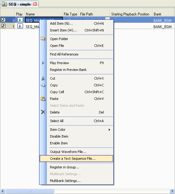 You can also create or add a sequence sound by right-clicking the Sequence Sound List and using the shortcut menu that displays.
