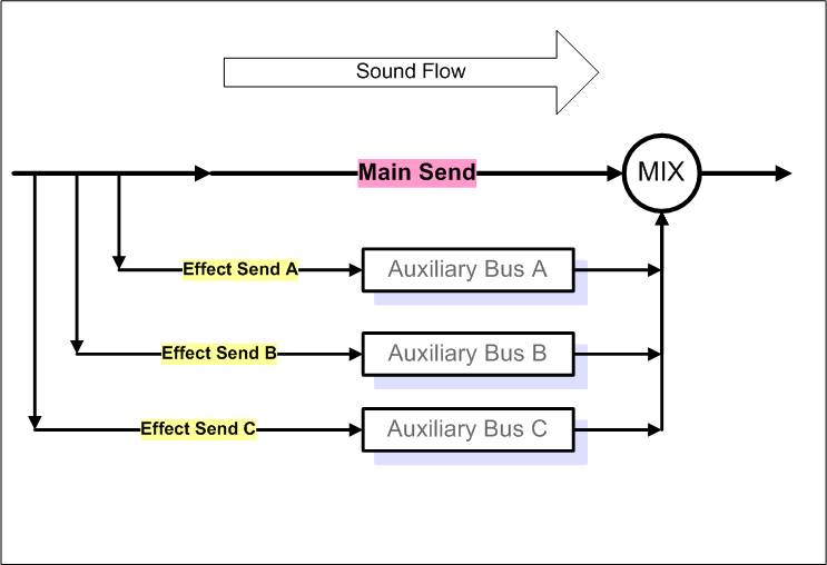 The send amount for the auxiliary and main buses are mixed as shown in the schematic below.