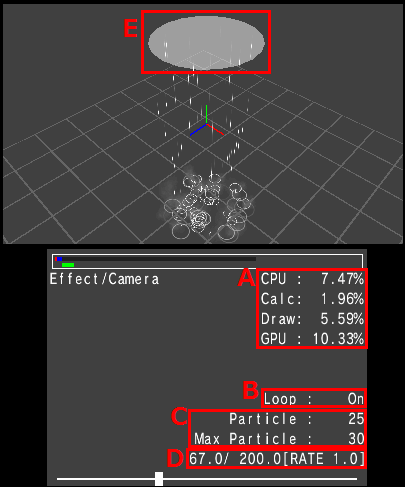 R Button & X/Y Button Increases/decreases the frames of looped particle playback. Each press of button increases/decreases number by 10 frames.
