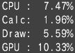 CPU:  The relative amount of time spent for animating and rendering, up through the completed sending of data to the GPU.