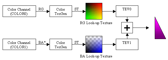 Figure 2 illustrates the algorithm used to interpolate vertex colors using the texture unit. The color texgen hardware can convert the output of the color channels into texture coordinates. The red component is used as S, and the green component is used as T. The resulting colors are then looked up with an identity ramp texture. Because the color texgen unit only converts the red and green channels, the blue and alpha channels need to be done in another texgen. * Please note that the BA vertex color information must be piped through the red and green channels.