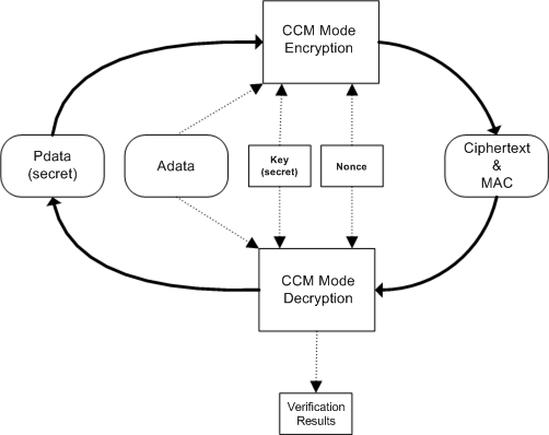 In CCM mode, the Pdata is encrypted and a MAC is generated for the sake of verifying the integrity of the Pdata. In addition to Pdata, the MAC can include information called Adata that is not encrypted but whose integrity must be verified. The Adata can include anything (for example, the data size). Decryption of the ciphertext requires the same key and nonce that were used during encryption. Verification of the ciphertext also requires the same Adata that was used during encryption.