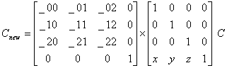 The current matrix is multiplied on the left by a 4x3 matrix. This process is equivalent to multiplying the current matrix by both a translation matrix and a 3x3 matrix. Each element of the matrix is a signed fixed-point number (sign + 19-bit integer + 12-bit decimal). If the current matrix is C, then the new matrix, Cnew, is in the format shown below.
