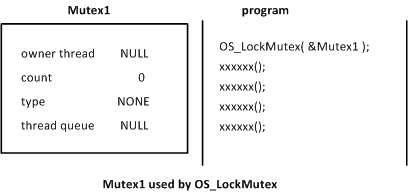 Suppose thread1 attempts to execute this program. thread1 executes the mutex lock function OS_LockMutex( &Mutex1 ). Because Mutex1 is not in use, thread 1 is recorded as the Mutex1 owner thread, the count is set to 1, and the program returns from the lock function. (The determination of whether Mutex1 is in use is based on whether the Mutex1 owner thread is NULL.)