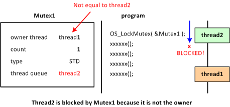Next, consider what happens when a separate thread, thread2, attempts to execute the same program. thread2 runs OS_LockMutex ( &Mutex1 )mutex1 is already being used in a lock. Since thread2 is not the mutex1 owner thread, thread2 cannot proceed any further. As a result, thread2 goes into a pause state. At this point, thread2 is registered inside the mutex1 thread queue as waiting for this lock to be released.