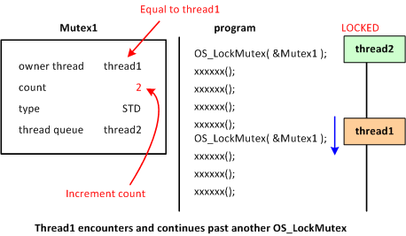 Now consider a case where thread1 once again runs OS_LockMutex ( &Mutex1 )mutex1 is already being used in a lock, but the mutex1 owner thread is the same as the current thread (thread1), so it can be bypassed. When this happens, the mutex1 count increments.
