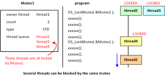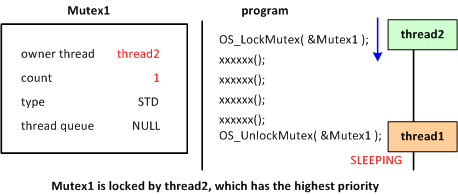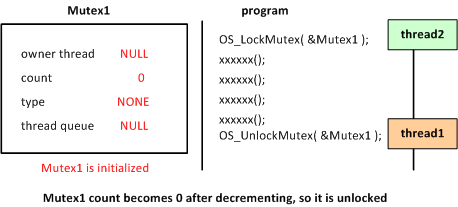 When thread1 runs OS_UnlockMutexthread1 can still continue. If this is the case, no thread re-scheduling occurs. In this way, mutex locks can take on a nested structure.