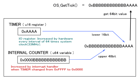 When the user needs a tick value, calling OS_GetTick() returns a 64-bit value. The value consists of the internal counter shifted left by 16 bits, with the current timer value appended to the counter.
