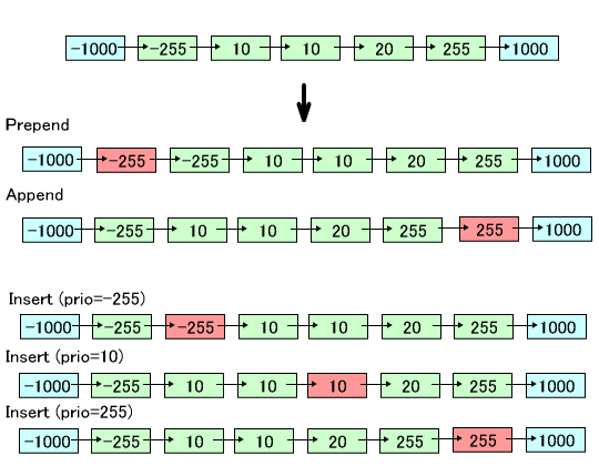 This shows where exit callbacks are registered using thePM_Prepend*,PM_Append*, andPM_Insert*functions on a list consisting of callbacks with priority -1000, -255, 10, 10, 20, 255, and 1000. Here thePM_Insert*functions illustrate using priorities of -255, 10, and 255, respectively.
