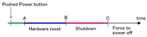 This is described in the following figure. When the Power Button is pressed, nothing will happen if it is released before A; a hardware reset will occur if it is released between A and B; a shutdown will occur if it is released between B and C; and the power will be forced to turn OFF immediately if the button continues to be held down past C. This hard power-off will occur even if the button is not released.