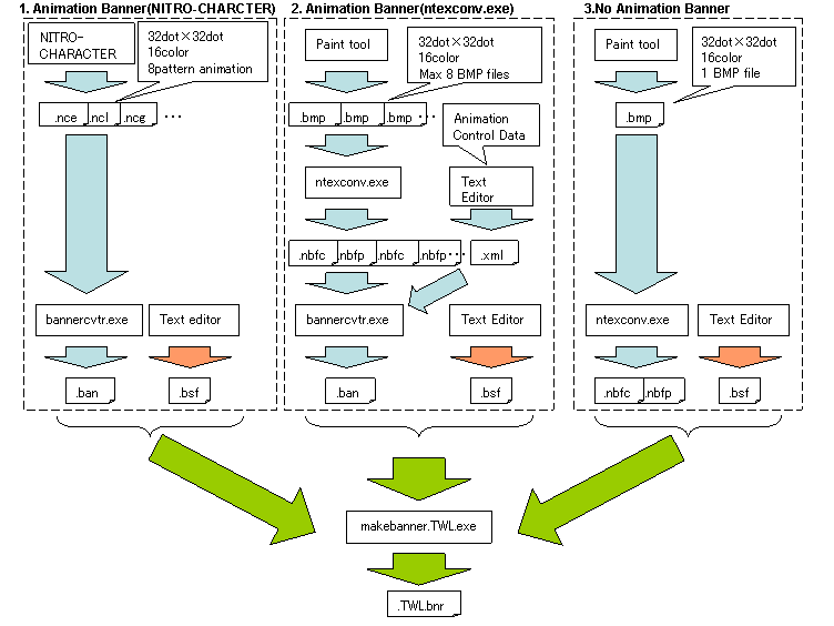 To create the banner file, use makebanner or makebanner.TWL (for Nintendo DS software and TWL-enhanced software, respectively) to convert both the data output by ntexconv and the BSF file that sets the banner comments.