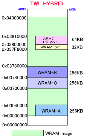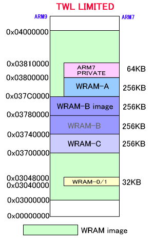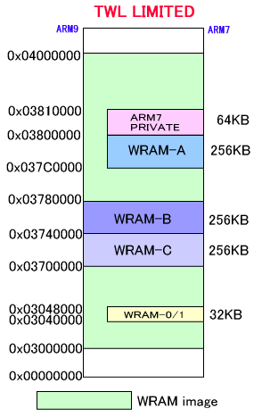 The three new 256-KB WRAM regions added to the TWL system are called WRAM-A, WRAM-B, and WRAM-C. The WRAM regions can be freely mapped within certain areas of the memory map to some extent, but with TWL-SDK, they are fixed to the positions in the table above and used that way.