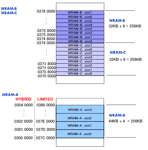 WRAM-A has four 64-KB slots, and WRAM-B and WRAM-C have eight 32-KB slots. Different processors can be assigned for each, and it is possible to change whether each slot can be used. In terms of the original physical hardware design, the slot assignment addresses can be changed within a certain range, but with TWL-SDK, the addresses are fixed to the values shown below. However, for TWL-exclusive ROMs, it is possible to place a larger ARM7 component by using the image region of WRAM-B or WRAM-C (described below).