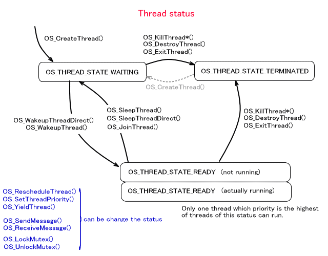 - A thread was put in an executable state. In other words, either OS_WakeupThread()OS_WakeupThreadDirect()OS_SleepThread function or the OS_SleepThreadDirect function was called. - The wait for another thread to end has started. In other words, OS_JoinThread() was called. - A thread has ended. The function operating in the thread has reached its final position and OS_ExitThread()OS_RescheduleThread() was called. - A thread thought to be the same level of priority has been explicitly rescheduled. In other words, OS_YieldThread() was called. - A thread priority has changed. In other words, OS_SetThreadPriority() was called. - The thread was terminated by another thread. In other words, either OS_KillThread*()OS_DestroyThread()